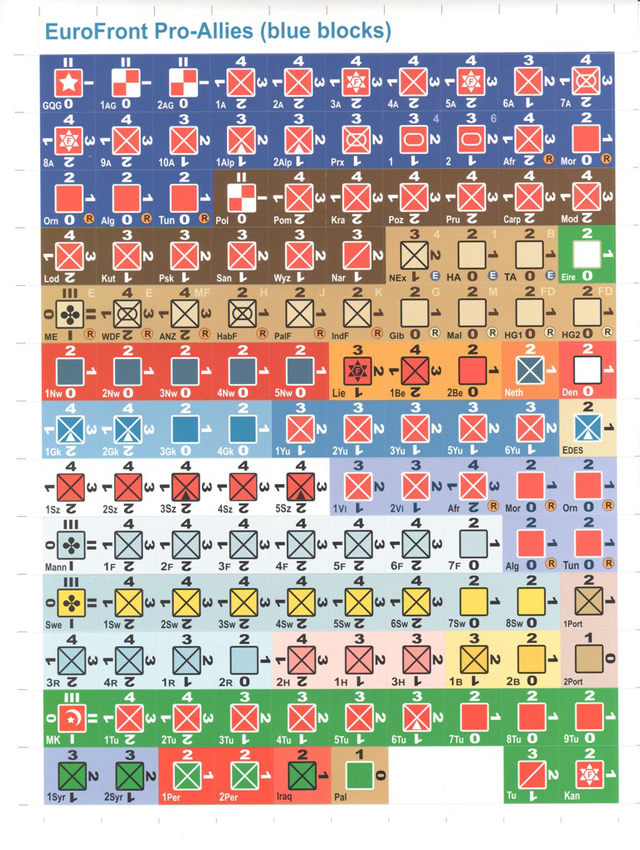 The game contains the EuroFront system rules and over 240 blocks for every European nation from Norway to Turkey. Axis and Allied versions are provided for most nations. Axis, Allied and Soviet units for the North and Mid-East fronts are also included. With the maps and blocks from EastFront and Westfront, you can now replay all of WW2 in a single weekend.