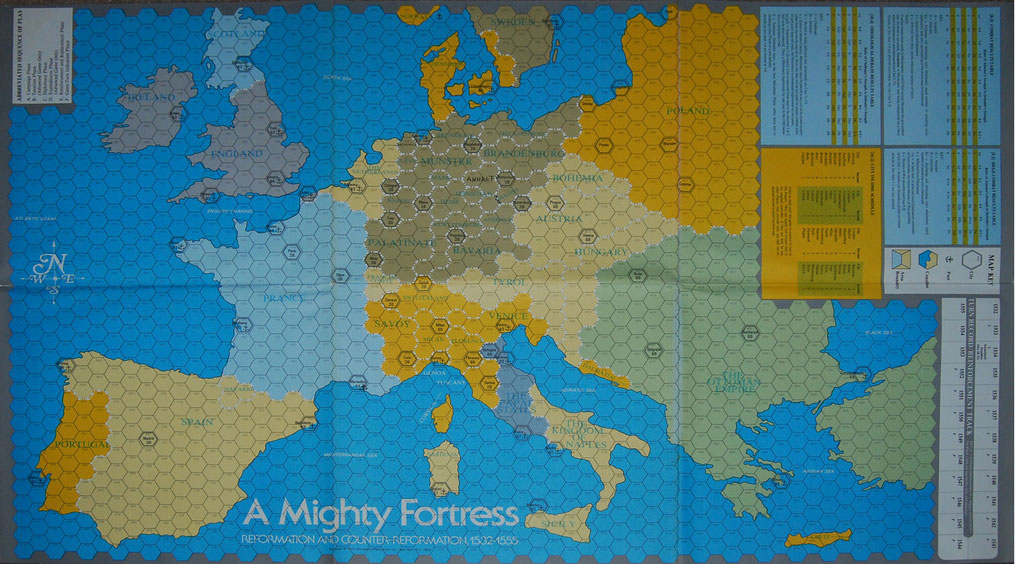 A Mighty Fortress simulates this major historical conflict on a beautifully illustrated political map of Europe. Colorful cardboard playing pieces move, position and engage in battle upon this map through a superimposed hexagonal grid.