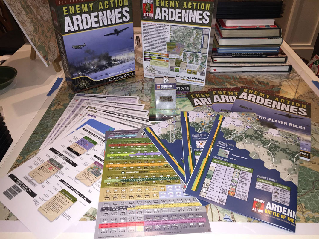 The first game in the series is Ardennes. The game portrays the German offensive against the western Allies in December 1944 -- the Battle of the Bulge. Each player controls the German or Allied side. When playing solo, the game system controls the other side. So Enemy Action: Ardennes is effectively three games in one box: the two-player game, solitaire playing the Allies, and solitaire playing the Germans.