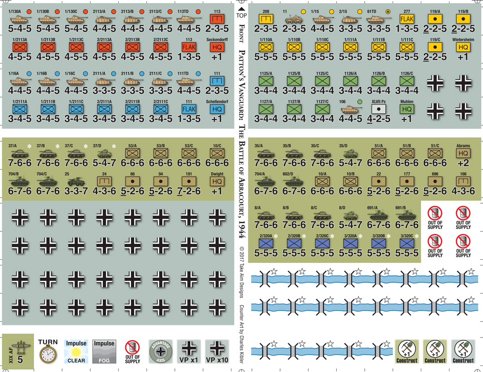 Patton’s Vanguard consists of two quick-playing four turn scenarios depicting the German attempt to drive the Americans from the German border. The first scenario pits two inexperienced German panzer brigades against a confident and veteran Combat Command A. The German side has more armor, including the superior Panther tank, and the poor weather generally favors them, but the American side has more artillery as well as better tactics and leadership. The second scenario pits the experienced German 11th Panzer Division against Combat Command A and the newly arrived Combat Command B, now hampered by restricted fuel supplies. In each scenario both players will be challenged to determine whether it is better to simply attack, or spend valuable time attempting to maneuver in continually changing weather conditions before attacking. Fast, furious, and chess-like, this is a game for players who love concentrated action!
