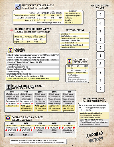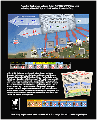 A Spoiled Victory is a solitaire game designed by Paul Fish and Hermann Luttmann that challenges the player with making decisions similar to what the British command was required to make during the evacuation at Dunkirk in May-June of 1940. Points are allocated each turn for defense of the perimeter, creation of evacuee units, and moving evacuees from the beaches to the safety of England. You cannot save them all, so you must pick who will stay and fight and who will escape to fight another day. The level of victory or defeat is measured by the number of troops and the amount of equipment that is saved through evacuation.