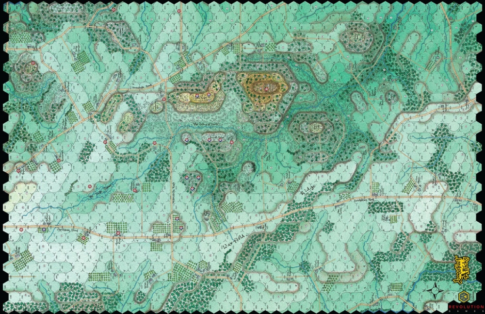The map is 22” x 34” hexagonal map of the entire south end of the Gettysburg battlefield. Each hex equal 150 yards and contains all the significant terrain details – elevations, slopes, woods, swamps, buildings, orchards, etc.