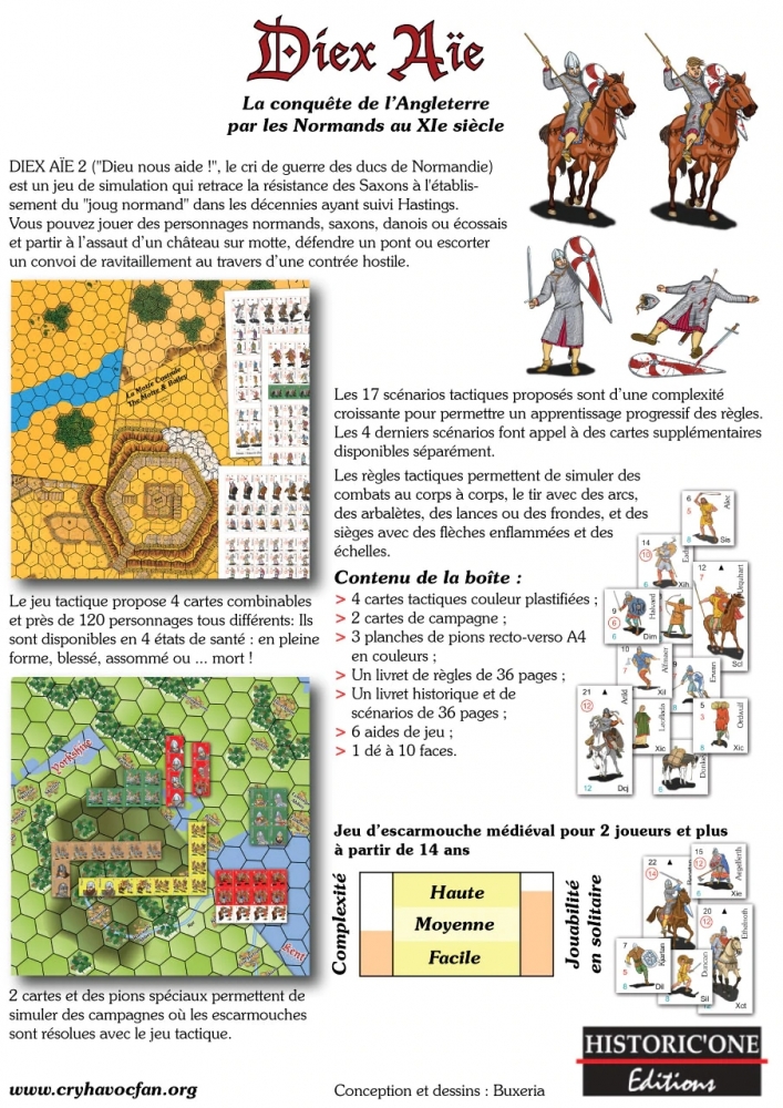 DIEX AÏE 2 ("Dieu nous aide !", le cri de guerre des ducs de Normandie) retrace la résistance des Saxons à l'établissement du "joug normand" dans les décennies ayant suivi Hastings. DIEX AÏE 2 propose un jeu de campagne permettant de générer des scénarios tactiques qui sont joués sur les cartes de la série. DIEX AÏE 2 est la suite du jeu GUISCARD 2. Comme ce dernier, DIEX AÏE 2 est un jeu complet, avec pions, cartes, règles, scénarios et aides de jeu.