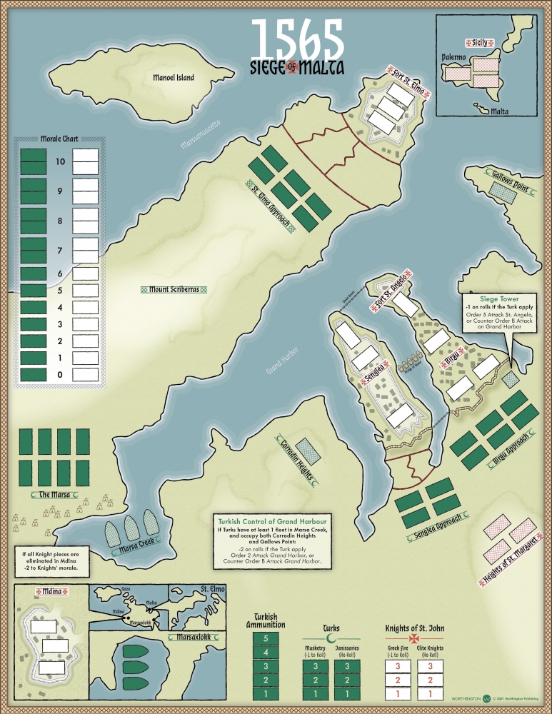 Les Turcs disposent également d'une quantité limitée de poudre à canon pour l'artillerie. Tant qu'ils sont approvisionnés, ils peuvent bombarder les forts de Malte. Les Turcs disposent également d'une tour de siège qu'ils peuvent utiliser.
