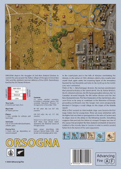 ORSOGNA dépeint les combats de la 2e division néo-zélandaise pour contrôler la zone autour du village italien d'Orsogna en décembre 1943 et la défense obstinée du LXXVI. Panzerkorps allemand menée par la 26. Panzer-Division.