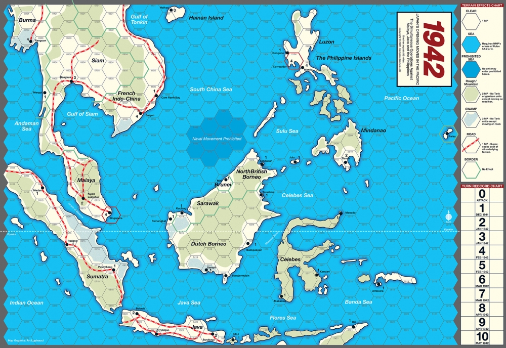 1942, The Japanese Campaign against Malaya, Java, and the initial attack in the Philippines (La campagne japonaise contre la Malaisie, Java, et l'attaque initiale aux Philippines) couvre les mouvements d'ouverture japonais au début de la guerre du Pacifique, et les opérations successives menées contre les différentes zones. La carte couvre toute l'étendue de l'Asie du Sud-Est à raison de 85 milles nautiques par hexagone. Le jeu est un véritable défi pour le joueur japonais qui doit essayer de nettoyer la carte des unités alliées.