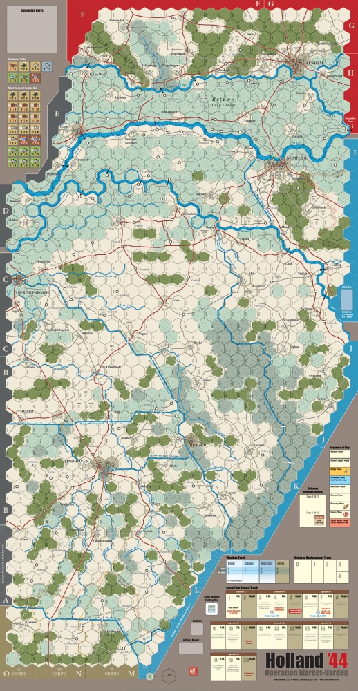 L'échelle de la carte est de 2 kilomètres par hexagone et couvre le champ de bataille de la frontière belge à Arnhem. La carte comprend également la zone où le 8e corps britannique a combattu sur le flanc droit du 30e corps.