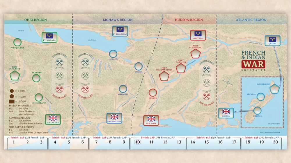 French and Indian War Solitaire, le frère de War of 1812 Solitaire, permet au joueur de commander le camp français ou britannique dans la guerre qui décide du sort de l'Amérique du Nord.