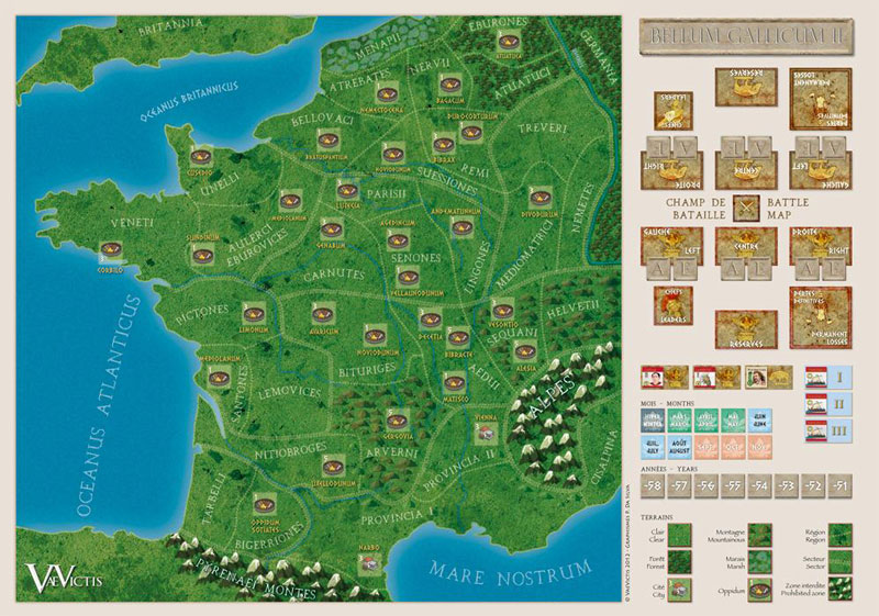 Unités : 1 pion par légion romaine, 1 à 3 pions par tribu gauloise.