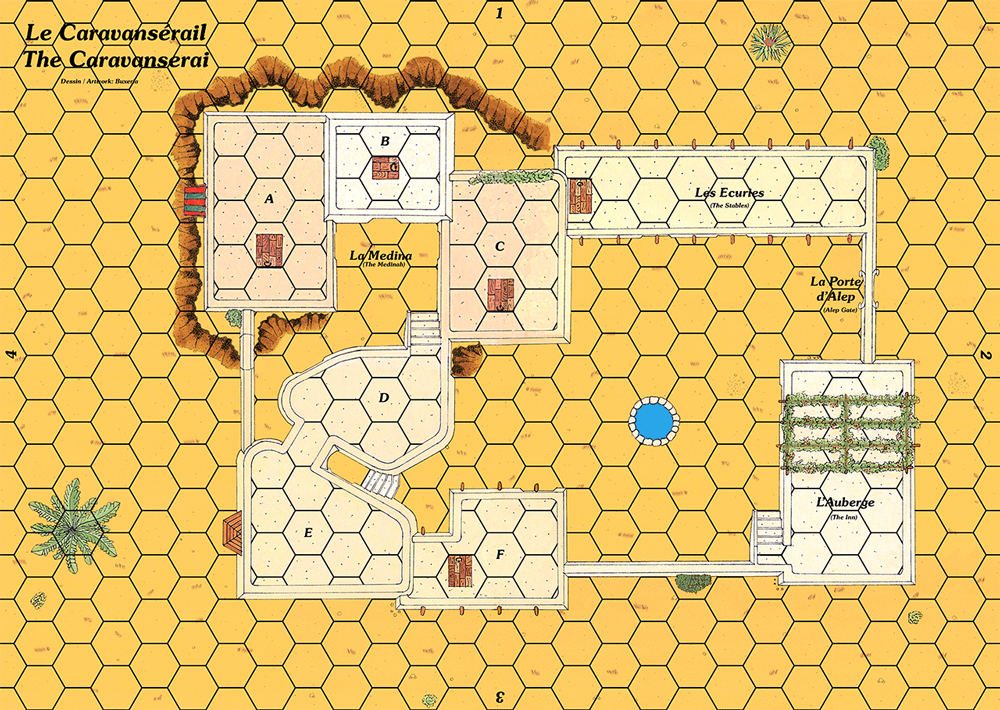 Carte montrant une cour entourée d'étables et d'une auberge. Un passage couvert permet d'accéder à une petite médina située plus haut.