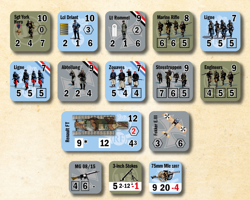 Stand with the French at Verdun. Charge forward with the Germans in Belgium and at the Marne. Follow the Americans as they slug their way into and through Belleau Wood. GWC offers sixteen historical scenarios including one introductory scenario for players not yet familiar with the general game system, a three players scenario and four scenarios with tanks. The replay value is high and a Random Scenarios Generator add even more depth. GWC will be expanded in upcoming sequels covering British, Russians, Austrians, Turks and Great War actions in Africa.