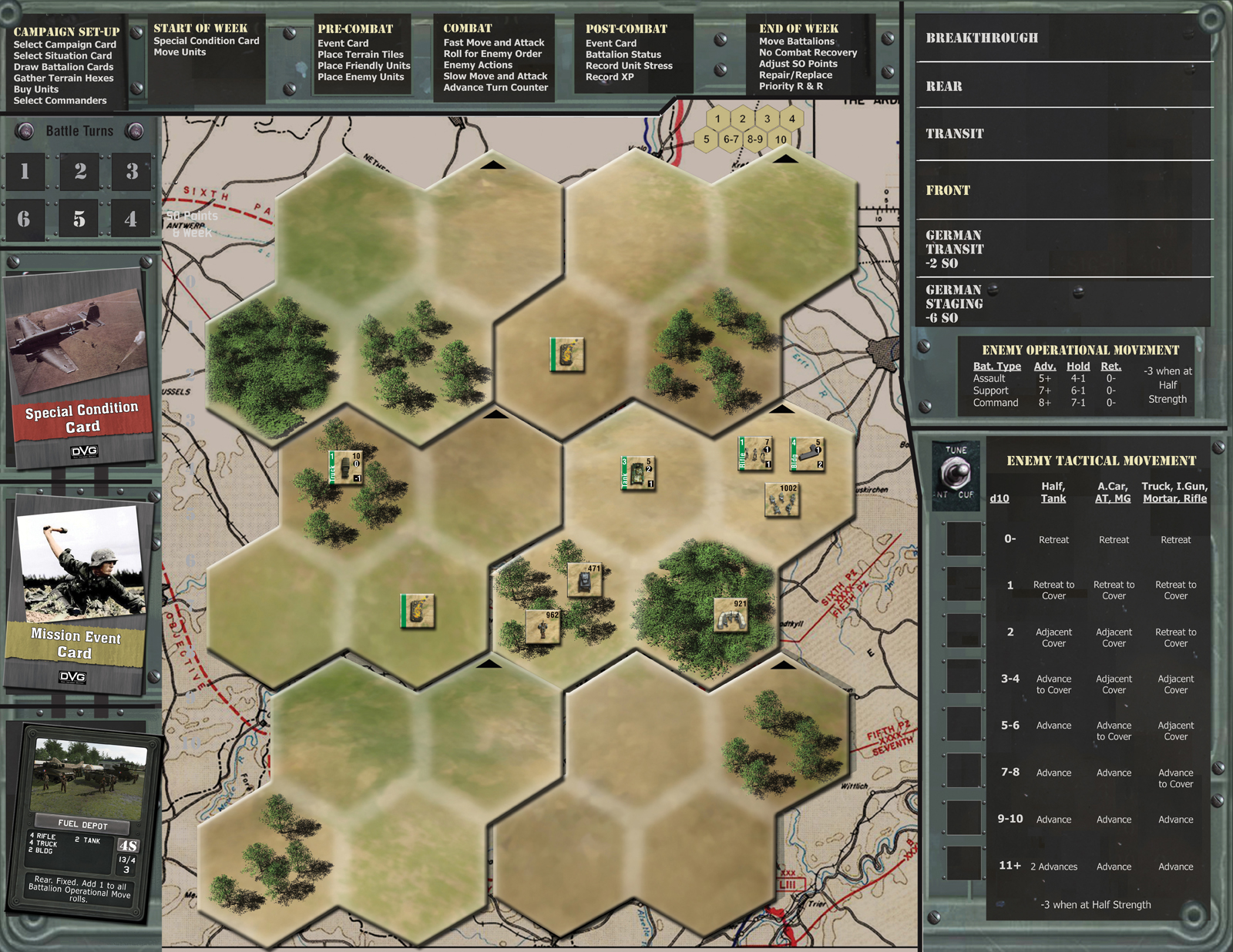 Missions are quickly resolved using an area movement system to display tactical combat. Speed and realism take top priority in this game. Terrain cards randomly generate each battlefield. Double sided terrain tiles provide everything from cities and farmland to snow covered forests and hills to sand dunes and oases.