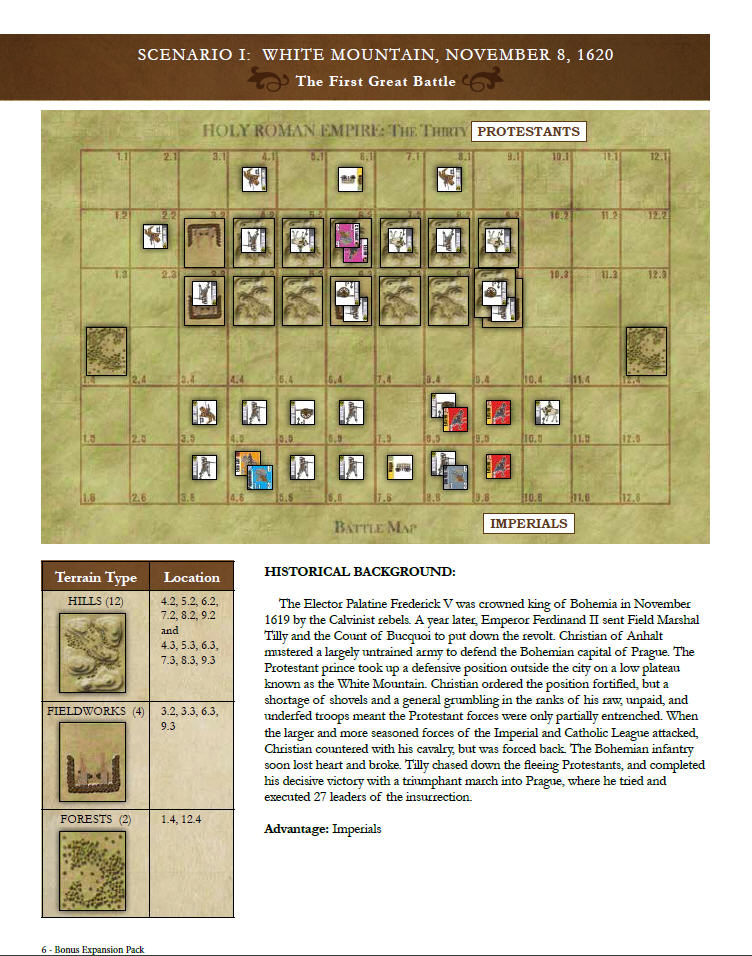 Holy Roman Empire is a strategic game, and while conflict is normally resolved abstractly by the throw of some dice, an Optional Tactical Combat system is included for those players seeking to add a bit more flavor to the game. This game-within-the-game system can also be used to re-fight some of the great battles of the Thirty Years War. The 12 scenarios included in this pack are not in-depth simulations of those epic contests; they are instead a collection of quick mini-games that are meant to allow players a glimpse into the way battles of that era were fought. As in any war, not every battle is an even contest; some are puzzles where players take turns commanding each army to see which of them can do better as the disadvantaged side--or through luck and skill turn an historic defeat into a surprising victory.