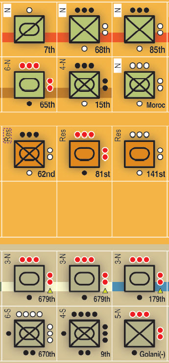 The Israelis start with few units but gain strength as reinforcements arrive, but will there be enough and will they get there in time? The Syrian player starts with a very strong force, but must attack at the right places and rely on rapid breakthrough across the Golan Heights in order to seize the objectives. Time is against the Syrians, with not only the Israeli reserves arriving, but also as the SAM barrier gets reduced and the effectiveness of the Israeli Air Force grows. The Syrians must strike hard and fast, then fight to hold on to their gains.