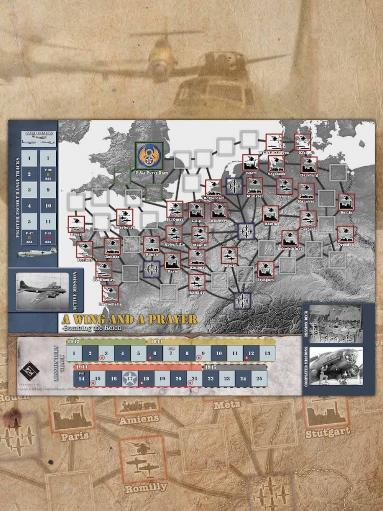 A WING AND A PRAYER is a design by Erik von Rossing where you, the player, assume the role of a Commander of a Squadron of B-17 “Flying Fortresses” stationed in England during World War II. In mid-1942, the United States Army Air Forces (USAAF) arrived in Britain equipped with B-17 Heavy Bombers. The B-17 was nicknamed the “Flying Fortress” because of their heavy defensive armament of ten to twelve .50 Caliber machine guns and armor plating in vital locations. Because of their heavier armament and armor, the B-17s tended to carry smaller bomb loads than British bombers. With all of this, USAAF and British Commanders adopted the strategy of taking on the Luftwaffe head on, in larger and larger air raids by mutually defending bombers, flying over Germany, Austria, and France at high altitudes during the daytime. They claimed that by using the B-17 and the highly classified Norden bombsight, the USAAF should be able to carry out “precision bombing” on locations vital to the German war machine, such as factories, naval bases, shipyards, railroad yards, railroad junctions, power plants, steel mills and airfields.