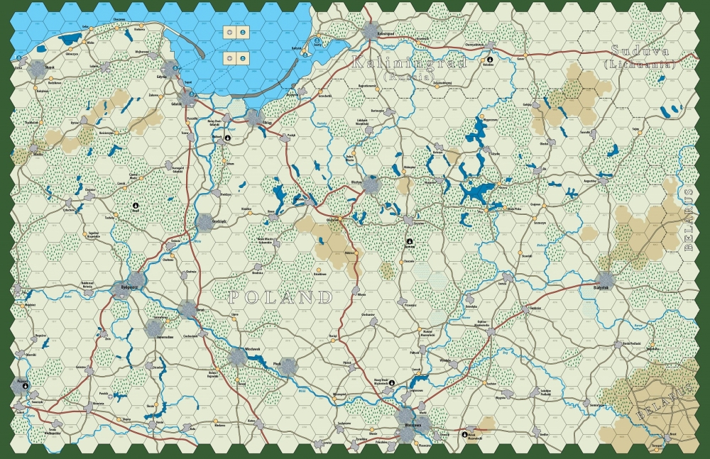 The game’s map represents the area in and around the eastern border of Poland at a scale of roughly 7.5 miles per hex. The map stretches from Kaliningrad Oblast in the north to Warsaw in the south, and from the Belorussian border west to Poznan.