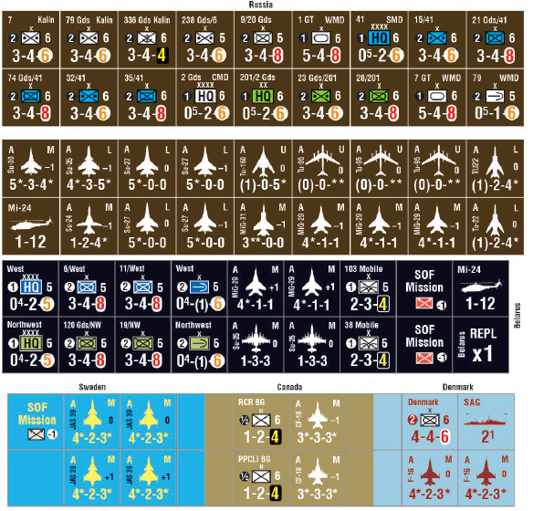 Ground units in Next War: Poland represent primarily brigades, regiments, and battalions of the armies of the Russia, her allies, and NATO. All ground units are rated for their attack and defense strengths, movement capabilities, and unit efficiency.