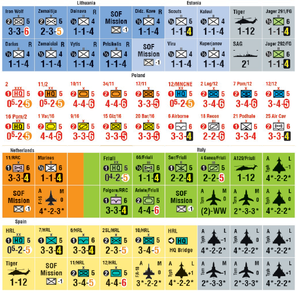 A large portion of Poland is represented by the Operational (hex) map, while the Baltics are represented by a Strategic Display (similar to Next War: Taiwan’s). The Russians are not the behemoth of the Cold War, but they possess good material and a much better trained army than before. The Baltics, using new rules and mechanics, may fall quickly, although their forces may put up some resistance and make an appearance as reinforcements, while the front quickly establishes itself in eastern Poland as the Russian 6th and 20th Armies push forward to seal the Suwalki Gap while NATO rushes forces into the area spearheaded by the Allied Rapid Reaction Corps and followed up by whatever nation’s troops respond to the Article 5 declaration. The question is, can NATO stop the Russians or will Poland be overrun while Russia presents the world with a fait accompli?