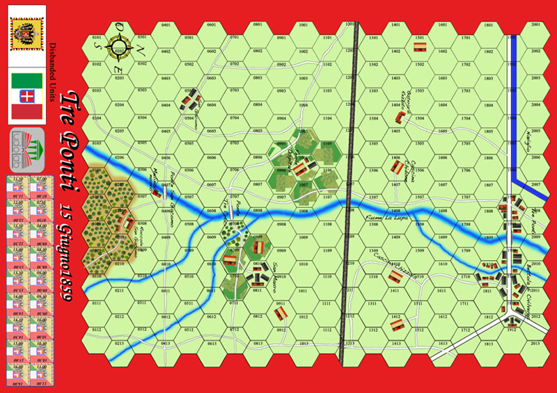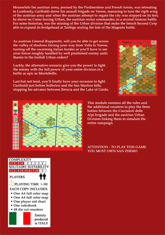 From Varese to Tre Ponti is an expansion to San Fermo with two more battles of the same 1859 Garibaldi campaign in the Italian Second Independence War. It contains two battles, each with their own small map, rules to play the three events as a campaign, and just a few information counters usable for both games. With a VP-based bidding, players can change almost all of the battle conditions, making each game different from the ones before.