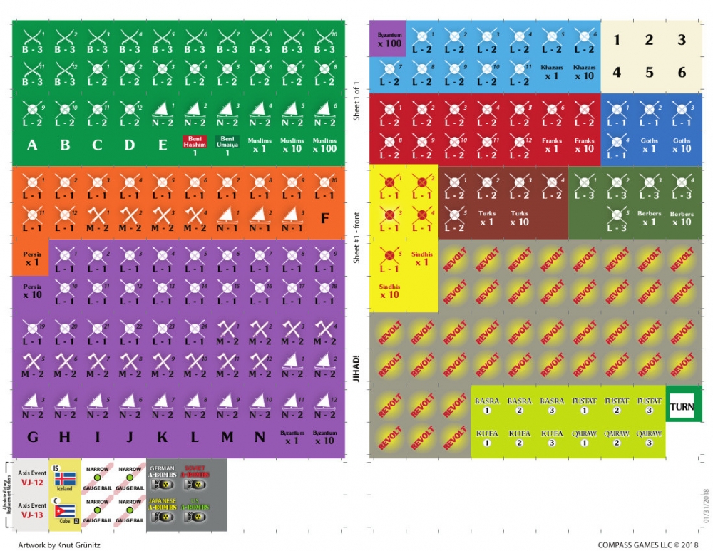 JIHAD! is a game type simulation of the first century of the Islamic expansion after the death of Mohammad, the Prophet and founder of the Islamic religion. During this period the holy war of conquest and religious conversion of non-Arab peoples were the mainsprings of Islam and the Arabs progressed from a religious force to a secular great power. JIHAD! covers these events on a grand strategic scale with each turn representing 5 years and military units representing entire armies. The game is for one or two players with one player controlling the Islamic forces and the other controlling all of the various opposing forces including the Byzantines, Persians, Berbers, Franks, Goths, Kaazars, Sinds, and Turks. Players alternate recruiting forces, engaging in religious conversion, moving their forces, and engaging in combat. The objective of the game is for the Muslim player to at least duplicate the conquests of Islam over the historical time frame while for the opposing player the object is to prevent that level of advance by Islam.