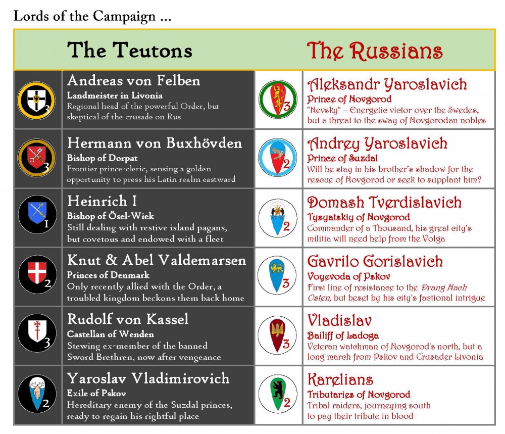 The sides every 40 days will levy various lords and vassals and their forces, transport, and capabilities, backed by higher political authorities—a papal legate for the Teutons and Novgorod’s city council (veche) for the Russians. Each lord is rated for fealty, lordship, service, and command and lays out his forces and assets on a mat. Wooden pieces represent units of knights, mounted sergeants, light and Asiatic cavalry, men-at-arms, and unarmored serfs and militia. Assets include counters for transport such as carts, boats, and sleds; provender to feed the army; and coin to pay for longer service or booty captured by ravaging or conquering enemy regions.