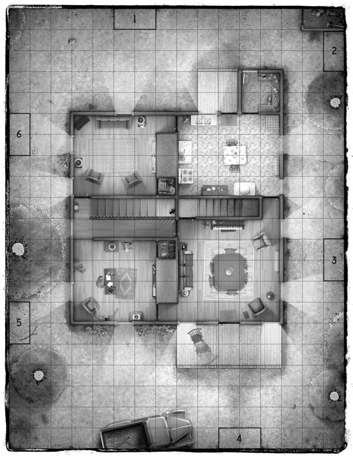 One 22 x 17-inch Game Board with a one-inch squares grid map of the house and yard where the game is set.