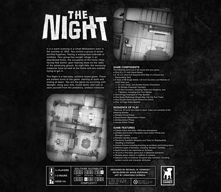 The Night is an exciting and fast-paced board game featuring a group of refugees who are fleeing a widespread outbreak of the undead. As night falls, the refugees find themselves in an “abandoned” middle-class home in a pleasant, midwestern community, perhaps an archetype of small-town Americana, the occupants of the home apparently having wisely fled earlier. The frightened fugitives in our story (herein referred to as “humans”) must defend themselves against slow-moving, but purposeful, flesh-eating creatures (we know them as “zombies”) during the long night, using their wits and whatever weapons or tools that come to hand, to survive until dawn.