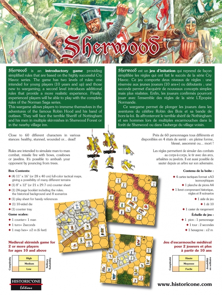 SHERWOOD is an introductory game providing simplified rules that are based on the highly successful Cry Havoc series. The game has two levels of rules: one intended for young players (10 years and up) and those new to wargaming; a second level introduces additional rules that provide a more realistic experience. Finally, experienced players will be able to play with the complete rules of the Norman Saga series. This wargame allows players to immerse themselves in the adventures of the famous Robin Hood and his band of outlaws. They will face the terrible Sheriff of Nottingham and his men in multiple skirmishes in Sherwood Forest or in the nearby village inn.
