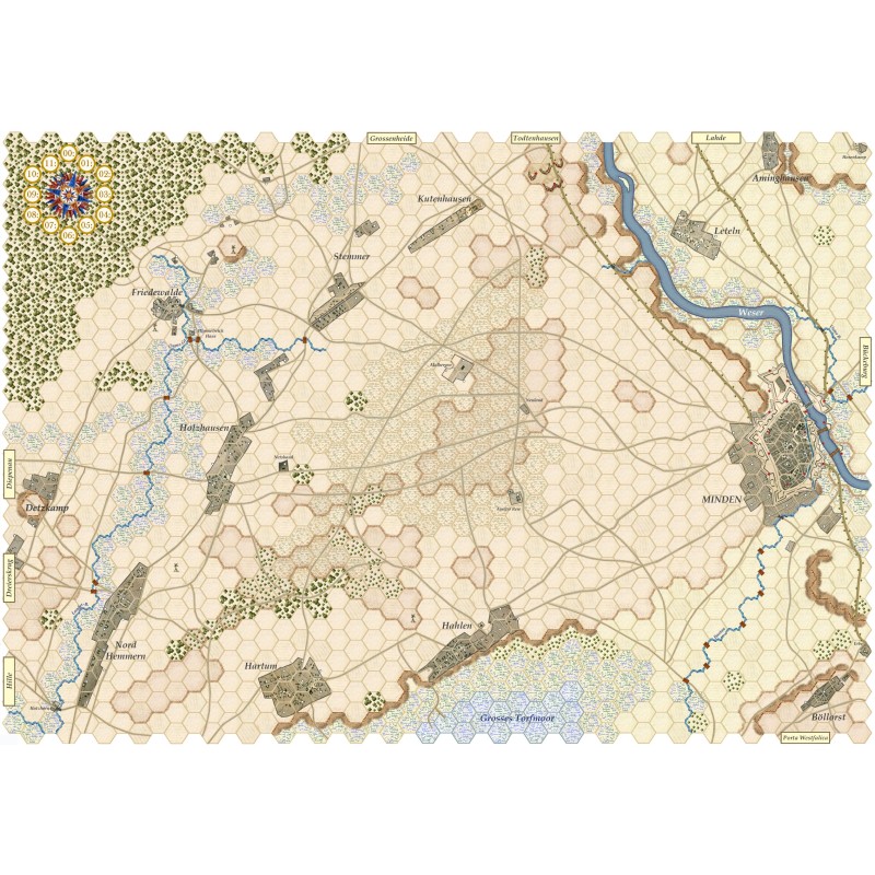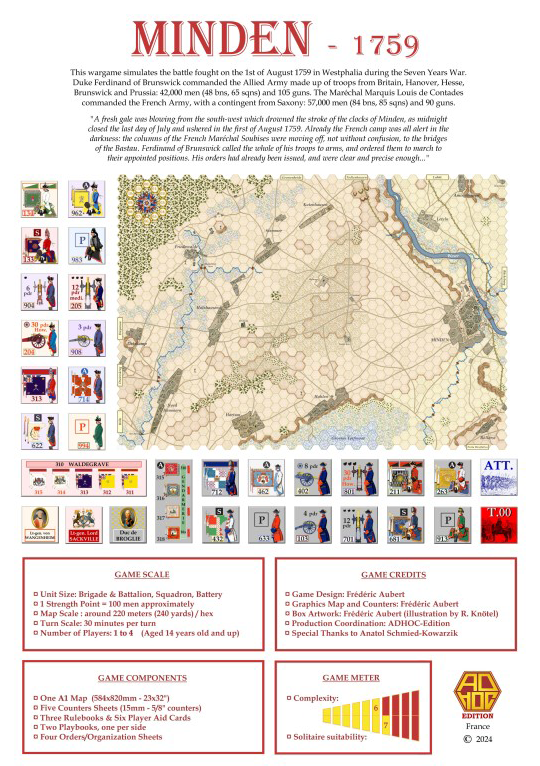 Minden 1759, the first game in the "SYWBS" series, simulates the battle fought on the 1st of August 1759 in Westphalia during the Seven Years War. Duke Ferdinand of Brunswick commanded the Allied Army made up of troops from Britain, Hanover, Hesse, Brunswick and Prussia: 42,000 men (48 bns, 65 sqns) and 105 guns. Marquis Louis de Contades commanded the French Army: 57,000 men (84 bns, 85 sqns) with 90 guns.