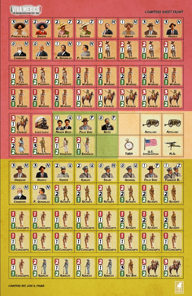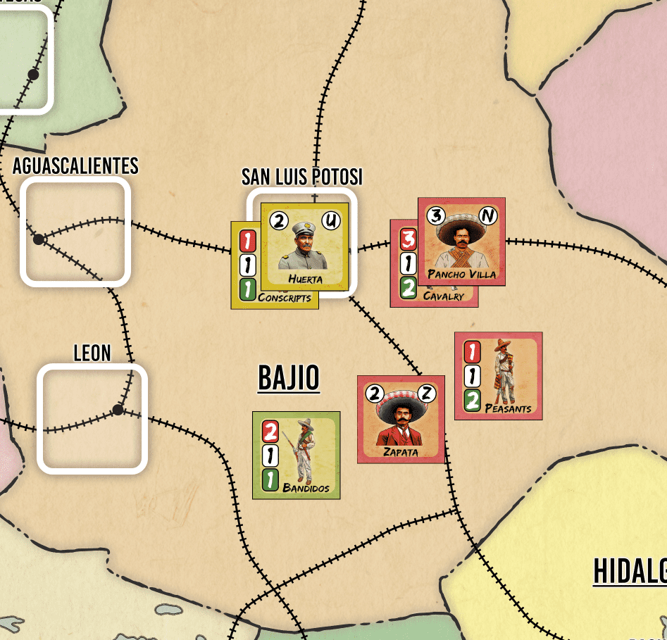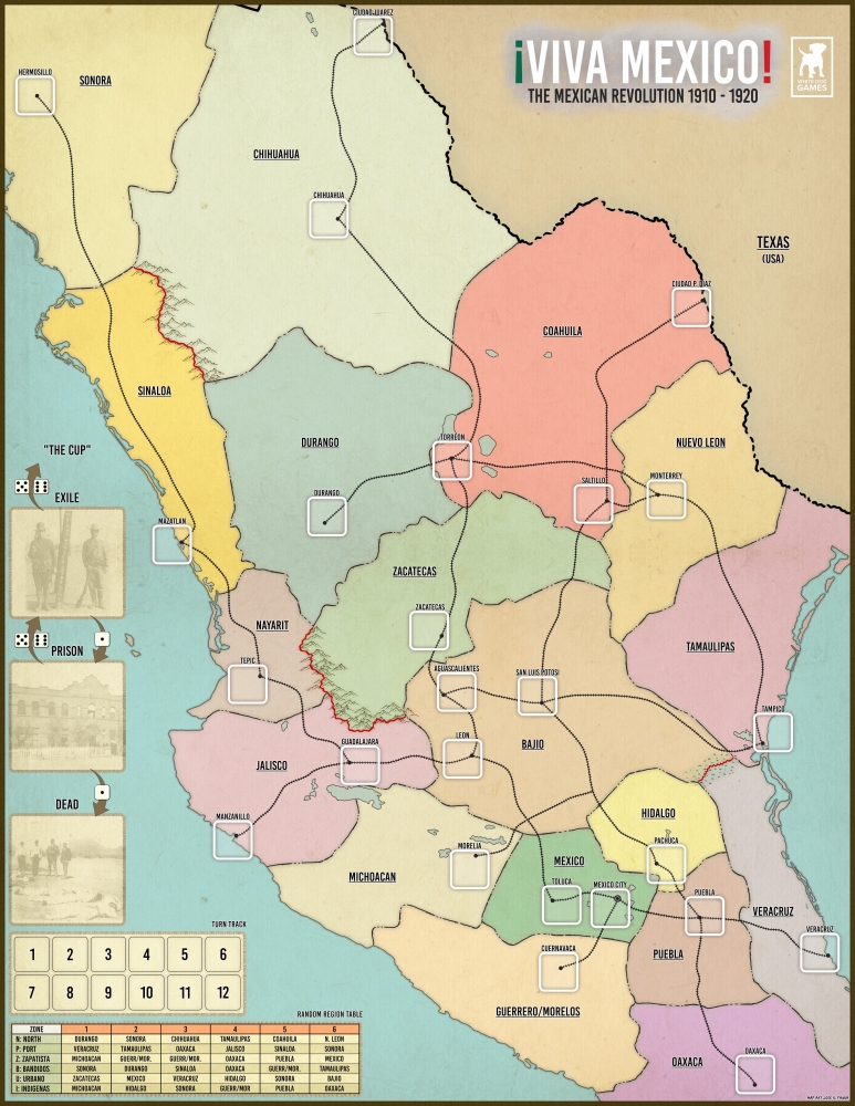 The game uses area movement between Regions (Mexican states) and their important Towns. As well as the military forces involved (cavalry, peasants, Rurales, conscripts and more) you will control the important characters of the revolution, such as Pancho Villa, Emiliano Zapata, Alvaro Obregon, the Magon Brothers, and many others. There are rules to govern their fate: will they escape to exile, be imprisoned, or "shot while trying to escape"...