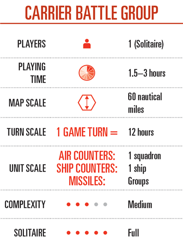 Carrier Battle Group deluxe edition is a solitaire game where the player contests against the game system, fulfilling scenario objectives, randomly generated by a Mission Orders chit pull. You must manage your US Navy Nimitz-class carrier, its air group, and your escorts, while encountering Soviet warships, aircraft, and missiles controlled by the game system. As the Carrier Group Commander, seeing the situation from the bridge of an aircraft carrier, you will be confronted with unexpected opportunities and challenges, represented by random Incident chits.