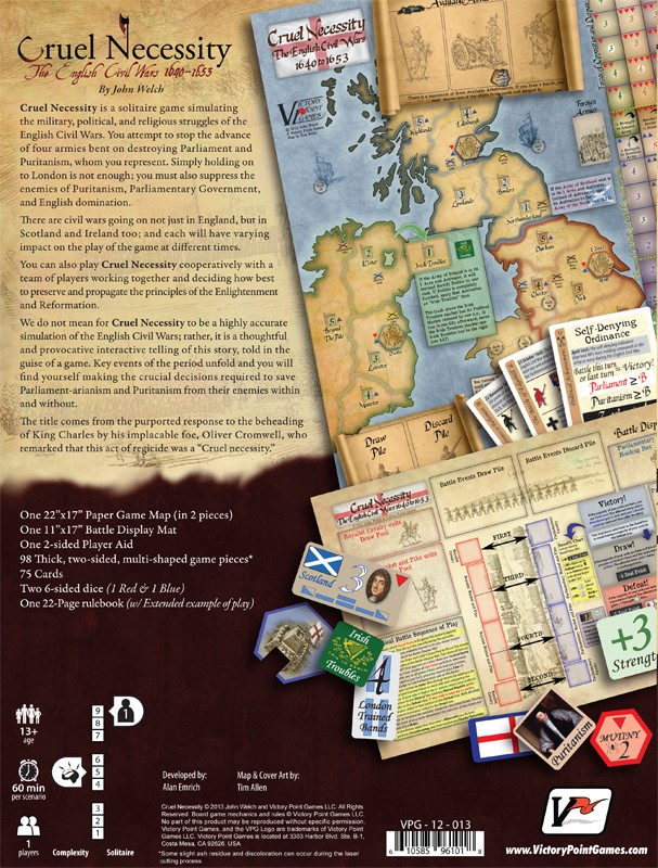 Cruel Necessity, from designer John Welch, is a solitaire game simulating the military, political, and religious struggles of the English Civil Wars (1640-53). You attempt to stop the advance of four armies bent on destroying Parliament and Puritanism, whom you represent; simply holding on to London is not enough!