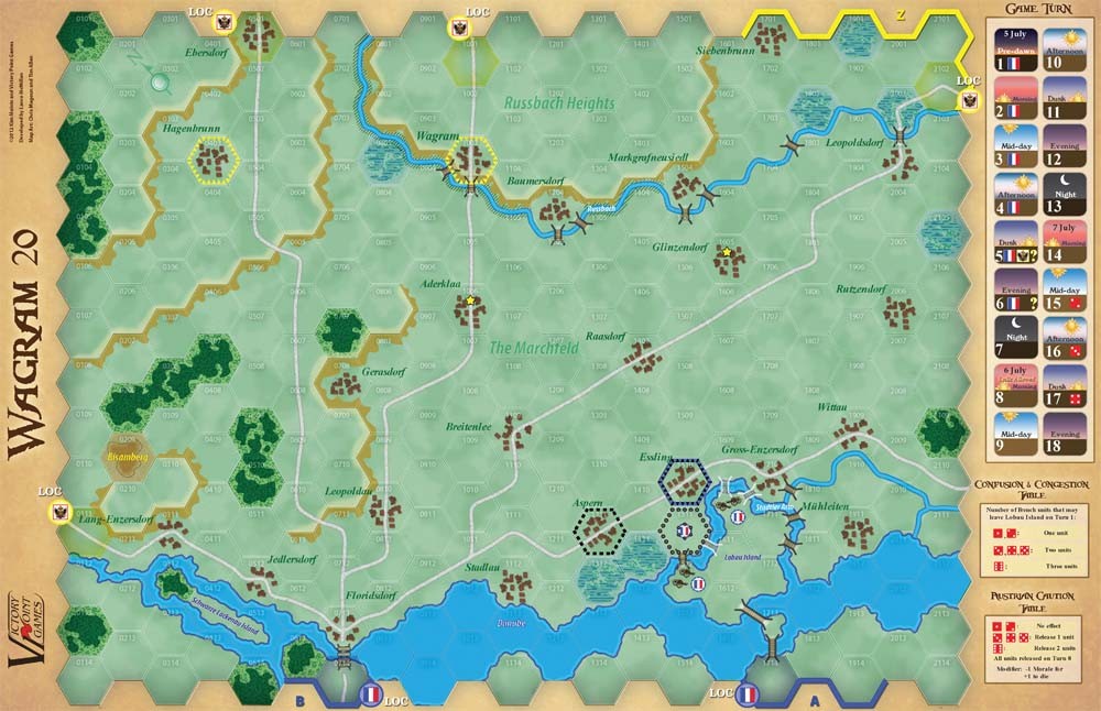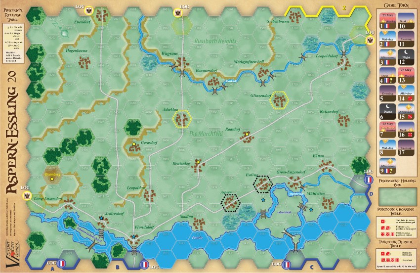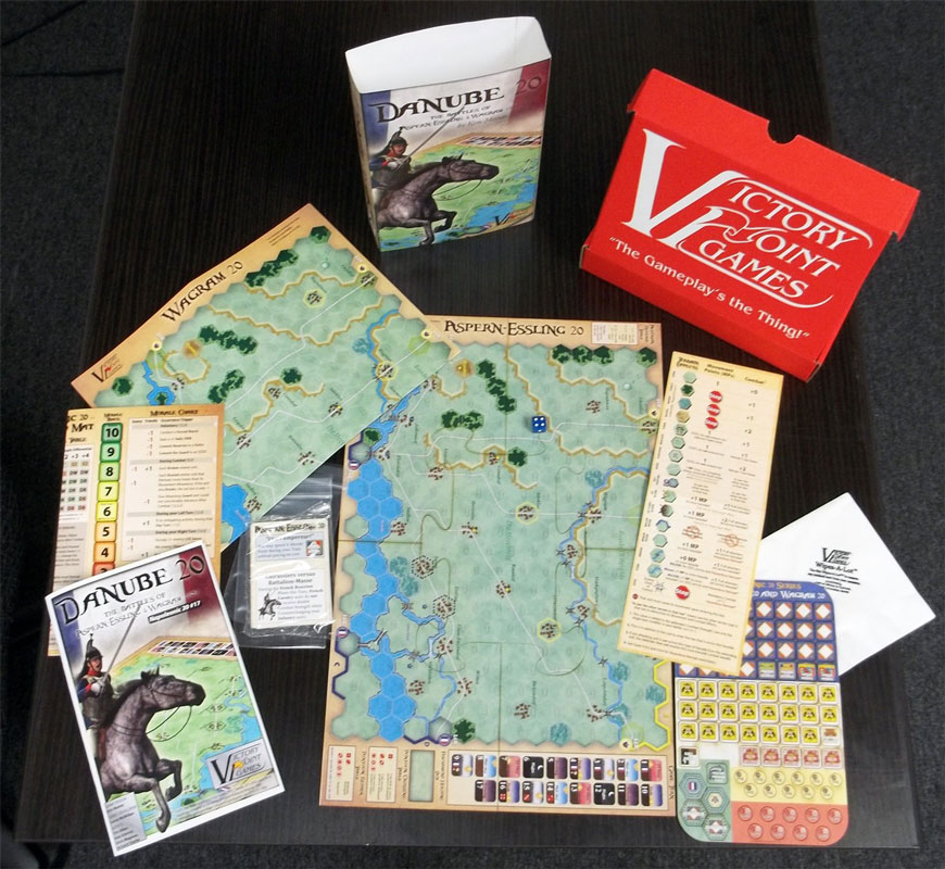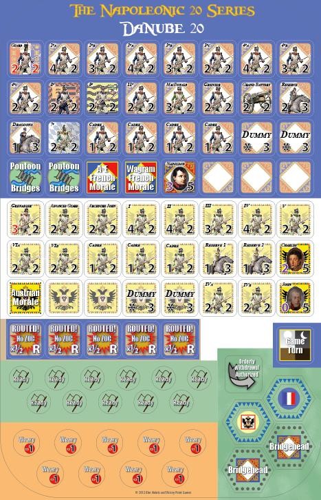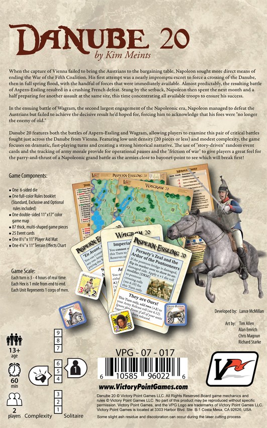 Danube 20, from designer Kim Meints, features both the battles of Aspern-Essling and Wagram, allowing players to examine this pair of critical battles fought just across the Danube from Vienna. Featuring low unit density (20 pieces or less) and modest complexity, the game focuses on dramatic, fast-playing turns and creating a strong historical narrative. The use of "story-driven" random event cards and the tracking of army morale provide for operational pauses and the "friction of war" to give players a great feel for the parry-and-thrust of a Napoleonic grand battle as the armies close to bayonet-point to see which will break first!