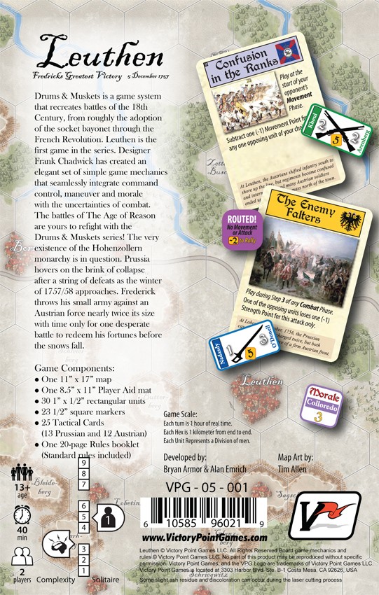 Drums & Muskets is a game system that recreates battles of the 18th Century, from roughly the adoption of the socket bayonet through the French Revolution. Leuthen is the first game in the series.