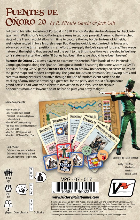 Fuentes de Oñoro 20, by designers R. Nicasio Garcia and Jack Gill, allows players to examine this tension-filled battle of the Peninsular Campaign, fought along the Spanish-Portuguese border. Featuring the same system as GMT's popular Fading Glory game, Fuentes de Oñoro 20 has low unit density (20 pieces or less on the game map) and modest complexity. The game focuses on dramatic, fast-playing turns and creates a strong historical narrative through the use of random event cards and the tracking of army morale providing a great feel for the parry-and-thrust of Napoleonic grand battle. Lead your troops forward into action to see if you can break your opponent's morale at bayonet-point before he puts your army to flight.