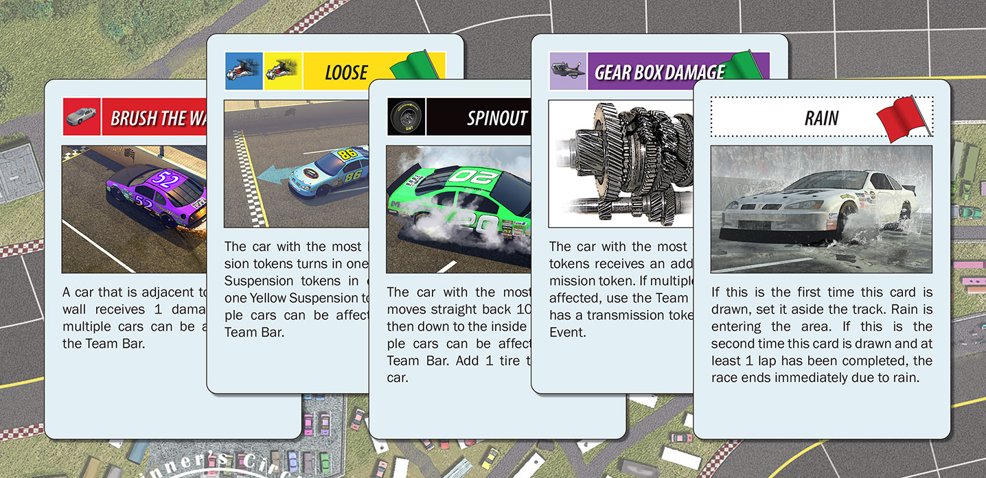 An events deck can make your strategy pay off or punish you for your failure to take precautions. Accidents, Yellow Flags, worsening track situations and deteriorating cars are all part of the game. Will a yellow flag save you or cut your momentum? Could all of your perfect strategy be derailed by those incoming rain clouds?