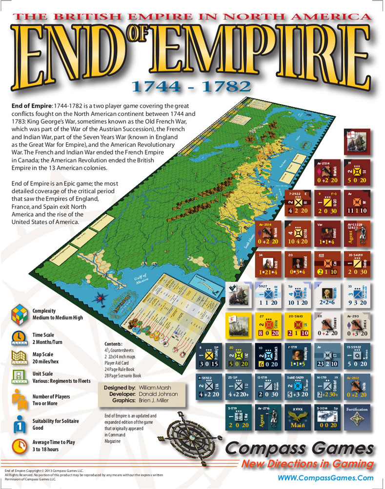 End of Empire: 1744-1782 is a two player game covering the three great conflicts fought on the North American continent between 1744 and 1783: King George’s War, sometimes known as the Old French War, which was part of the War of the Austrian Succession), the French and Indian War, part of the Seven Years War (known in England as the Great War for Empire), and the American Revolutionary War. The French and Indian War ended the French Empire in Canada; the American Revolution ended the British Empire in the 13 American colonies. An additional bonus scenario covers the War of Jenkin's Ear between Spanish Florida and British Georgia.