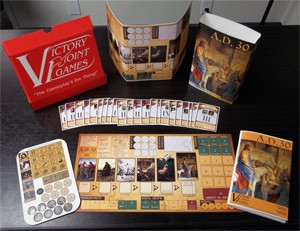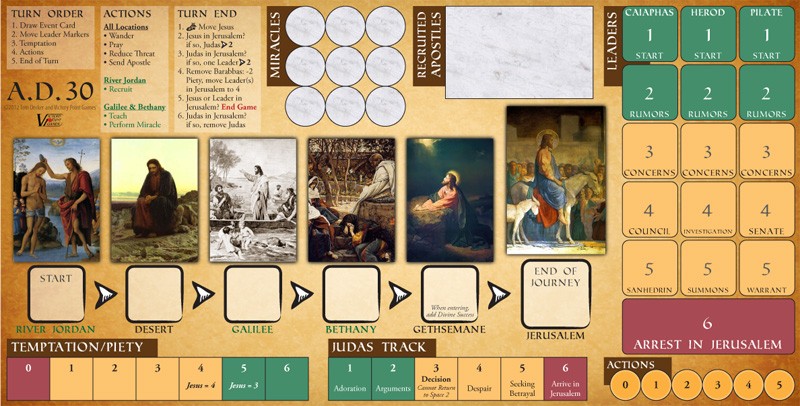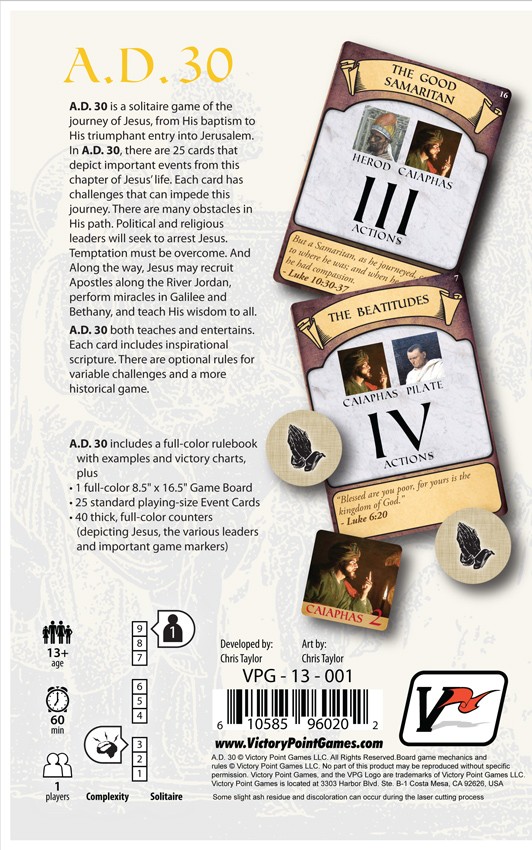 Tom Decker's A.D. 30: Jesus' Journey to Jerusalem is a very reverent solitaire game that takes you, as the player, along the travels of Jesus, from His baptism in the River Jordan to His triumphant entry into Jerusalem. Along the way, you will make decisions which will affect the outcome of His journeys and teachings. Thirteen possible alternate outcomes are included, not to imply that other outcomes were in fact possible, but to build a strategy game that includes challenges with the possibility of success and failure as the player of the game. Achieving the Major Victory (the historical outcome) will demonstrate the extraordinary set of circumstances that took place and were necessary to achieve the birth of Christianity.