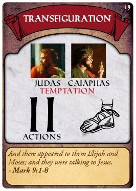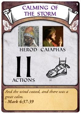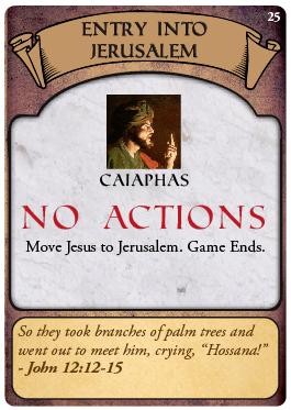 The events that take place often cause the political and religious leaders of the area (represented by Caiaphas, Herod Antipas, and Pontius Pilate) to take notice and become increasingly concerned. In game terms, this is shown by moving those Leader markers along a track on the game board, advancing them from their start spaces one step at a time until they reach the final space on that track (“Arrest in Jerusalem”), at which point they attempt to arrest Jesus.