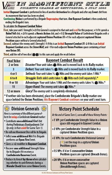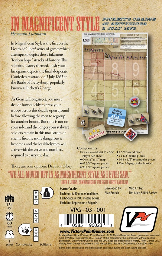 n Magnificent Style, from designer Hermann Luttmann, is a solitaire game depicting the final desperate Confederate attack on 3 July 1863 at the Battle of Gettysburg, popularly known as Pickett’s Charge. As General Longstreet, you must decide how quickly to press your troops across this deadly open ground before allowing the men to regroup for another bound. But time is not on your side, and the longer your stalwart soldiers remain in this maelstrom of enemy fire, the more dangerous it becomes, and the less likely they will arrive with the verve and numbers required to carry the day.