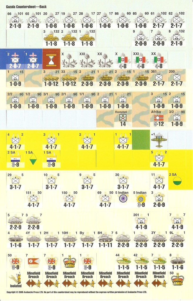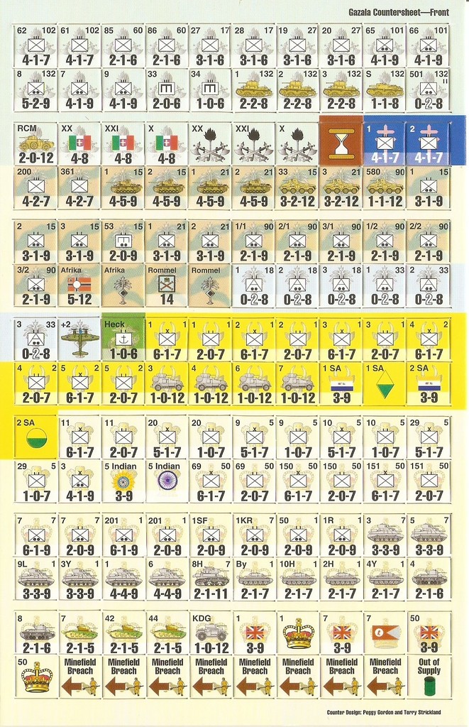 Gazala simulates the critical battle in the summer of ’42 that led to the fall of Tobruk and the arrival of the Axis armies at the gates to the Nile delta. We’ve shown the battles before on a tactical level in our Desert Rats game. With 140 game pieces and one 22x17-inch map, Gazala’s three scenarios can be played in one to eight hours. The game system is very similar to that in Alsace 1945, with the addition of anti-tank fire. Most units are brigades or regiments, with a few battalions as well (usually tanks). Italian, German, British, South African, Indian and Free French units are represented.
