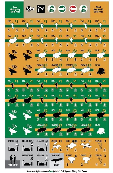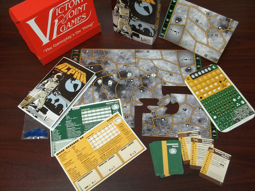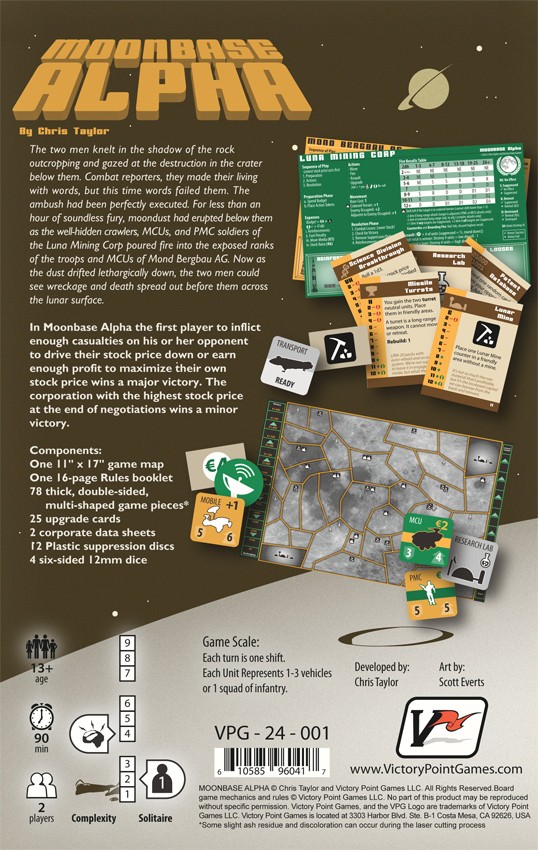 Moonbase Alpha, from designer Chris Taylor, is a simulation of lunar combat in an alternate history between two exo-planetary private corporations that have hired private "security" companies to enforce their territorial and intellectual property rights. In Moonbase Alpha, the first player to inflict enough casualties on his or her opponent to drive their stock price down or earn enough profit to maximize their own stock price wins a major victory. The corporation with the highest stock price at the end of negotiations wins a minor victory.