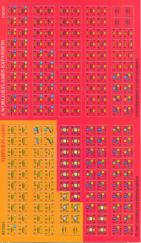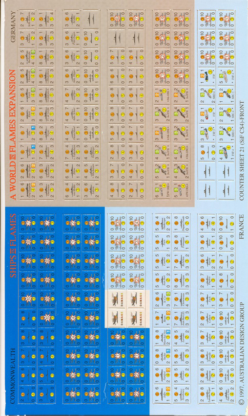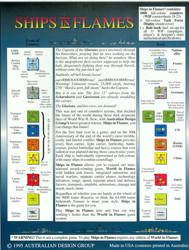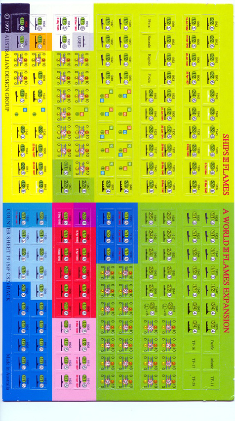 2007 Ships in Flames is an expansion for World in Flames that contains 1000 ships depicting every major CV, BB, CA, Sub and tramp steam-ship of World War II all in full-colour realistic camouflages.