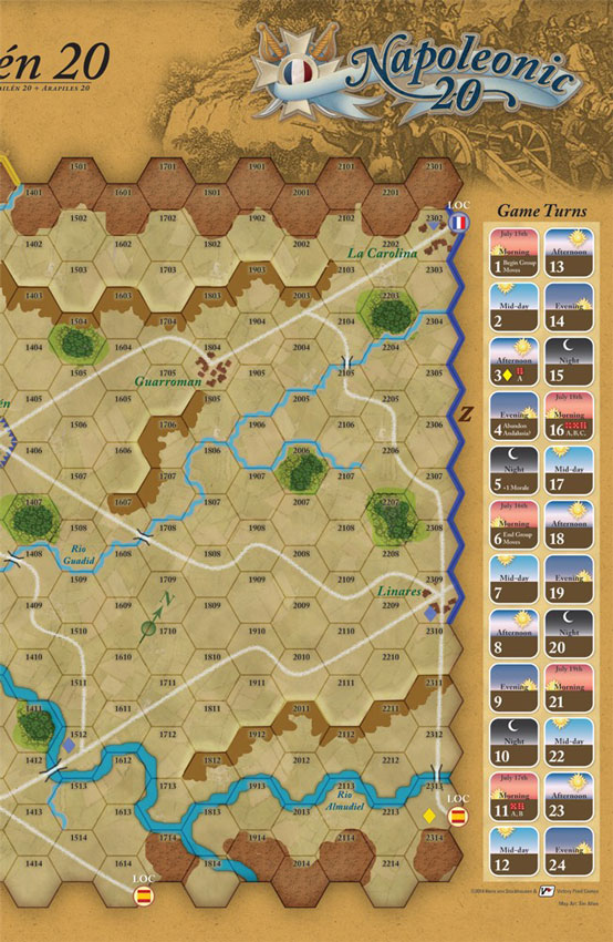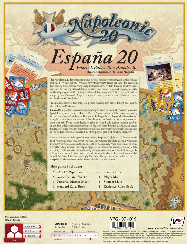 Hans von Stockhausen's Bailén 20 (July, 1808) showcases the stunning triumph of General Francisco Castaños’ Spanish army over French General Pierre Dupont’s Corps d’Observation operating in the mountains of Andalusia. This game challenges both players: The Spanish must struggle to coordinate the actions of their large and enthusiastic but mostly untrained army, while the French must decide whether to try and hold against superior numbers or conduct a fighting withdrawal back to Madrid. With Spanish guerrillas, a baggage train full of looted treasure, and treacherous Swiss mercenaries who might change sides in the middle of the battle, Bailén 20 offers players plenty of military adventure.