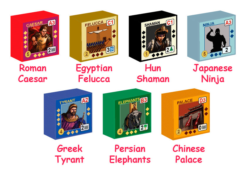 An expansion blockset for Wizard Kings. It contains 21 blocks: an assortment of 7 historical armies: Egyptians, Greeks, Persians, Romans, Huns, Chinese, and Japanese. The units in each box are different but there are always 3 blocks for each army (color). Every box adds useful blocks to your game.