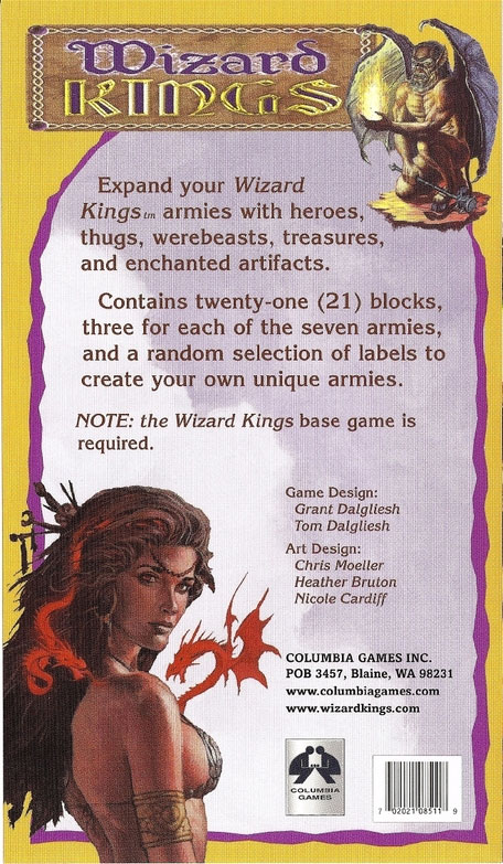 This is the primary expansion blockset for Wizard Kings 2nd edition. It contains 21 blocks: an assortment of all 7 armies. The units in each box are different but there are always 3 blocks for each army (color). Buy several sets; every box adds useful blocks to your game.