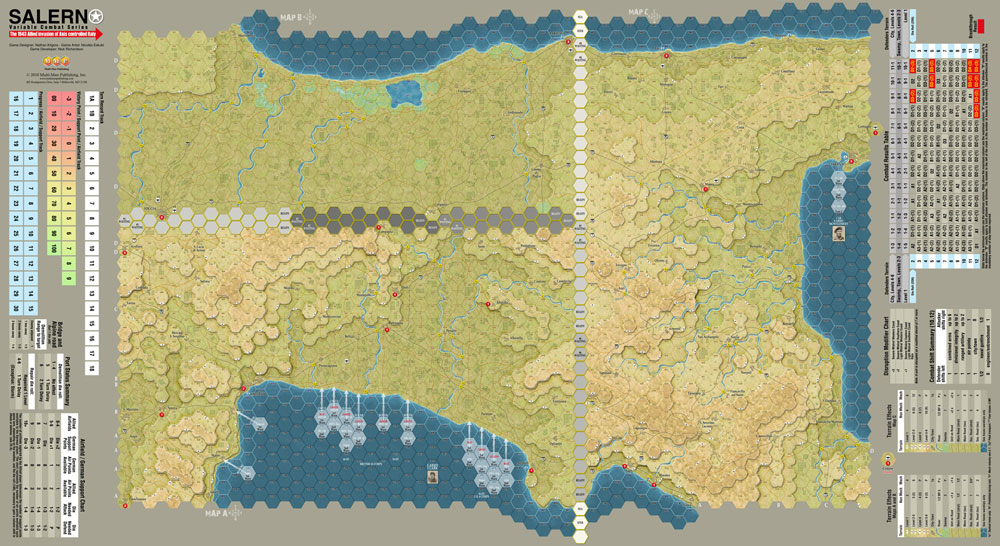 The main invasion, Operation Avalanche, is portrayed on Map Section A which is 1/3 of the map at 1 mile per hex. The east coast, Map Section B, is also at 1 mile per hex and contains strategic ports, highways and the main Axis airbase of Foggia. The last 1/3, Map Section C, is drawn up at 3 miles per hexside and is used by for the other two main operations, Operation Slapstick, the capture of Taranto, and Operation Baytown, the methodical capture of the Calabrian peninsula (toe of Italy).