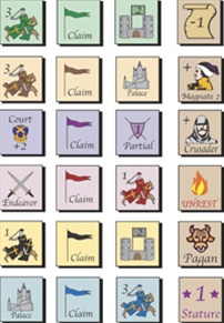 Between the glories of Rome and the rise of national states stood an age in which each land was defined by the virtue and failings of its monarch. Empires of the Middle Ages is a multi-player game of diplomacy in which up to six may act as dynasts and attempt to build their historic kingdoms into vast empires. Empires of the Middle Ages is played on a map of medieval Europe on which the players record the power of their kingdoms. Playing cards resolve the basic actions of the game, while random event cards add period flavor, such as plagues, crusades and heresy. Six scenarios are included, from a solitaire game to a grand scenario covering the entire Middle Ages.