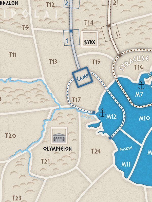 Syracuse 415-413 av. J.-C. est un jeu d’histoire pour deux joueurs retraçant les batailles terrestres, les combats navals et les opérations de siège menées par le corps expéditionnaire athénien de Sicile, pour tenter de vaincre les Syracusains, alliés des Spartiates, au cours de la guerre du Péloponnèse. Le jeu est publié en encart de l'édition spécial jeu du Vae Victis n°103. Il est prévu pour deux joueurs (Athènes et alliés vs. Syracuse et alliés). Un tour de jeu couvre trois mois de temps réel. Le jeu comprend : - 1 livret de règles en couleur de 16 pages (14,5x21 cm) - 1 carte 29,7x41 cm (27 zones terrestres et 12 zones maritimes) - 1 planche de 108 pions prédécoupés (68 chefs et unités de combats, 22 stratagèmes et 18 marqueurs) - 1 scénario historique et un scénario “Et si ?” avec Alcibiade comme chef athénien Note : Les règles reprennent les bases de celles de Sphactérie 425 av. J.-C (VaeVictis n°95) auxquelles s’ajoutent des règles spécifiques de travaux et de sièges ainsi que d’autres développements.