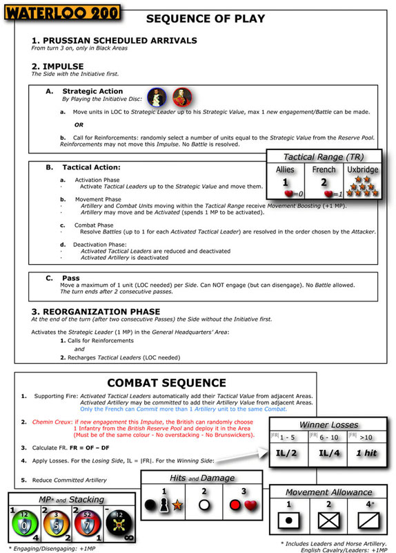 WATERLOO 200 is a light wargame covering the last battle fought - and lost - by Napoleon on 18th June 1815, just before his second and ultimate abdication. Units represent all the historical Infantry and Cavalry Brigades, Artillery and Major Leaders involved in the battle, from the morning to evening in that 10-hour long carnage. Although based on a historical event, the players in command of the two sides can modify the course of History in early XIX Century Europe. The game is recommended for two or three players, but has excellent solitaire suitability.